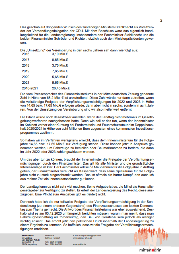 In einem Schreiben, welches dem Landesfeuerwehrverband am 23.11.2020 zuging, äußerte sich Rüdiger Erben (Parlamentarischer Geschäftsführer der Sozialdemokraten in Sachsen-Anhalt) zur aktuellen Situation in Bezug auf die Förderung des kommunalen Brandschutzes in unserem Bundesland. Im Brief wird unter anderem genau beleuchtet, in wie weit die Feuerwehren in den vergangenen Jahren durch das Land Sachsen Anhalt gefördert wurden.