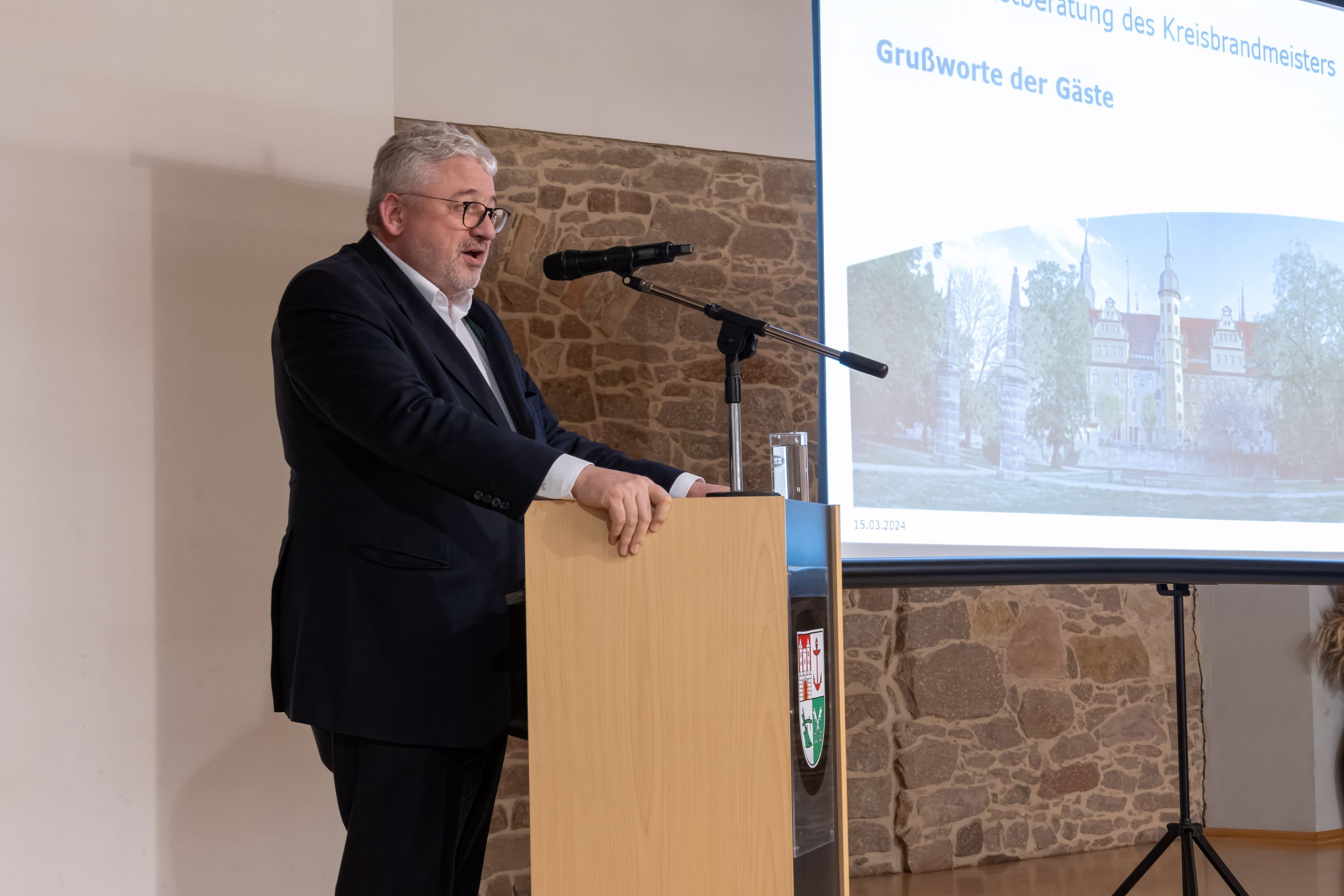In seinem Grußwort hob Herr Berkling die besondere Bedeutung des Saalekreises hervor, der einer der wirtschaftlichen Leuchttürme im Bundesland ist. Neben den Grüßen an die Feuerwehren hatte er auch gute Nachrichten im Gepäck: die Finanzmittel für die Förderung der Feuerwehren werden im kommenden Jahr ca. 24 Millionen Euro betragen. Dann soll neben der Förderung von Feuerwehrfahrzeugen auch der Bau von Feuerwehrhäusern wieder finanziell unterstützt werden.
