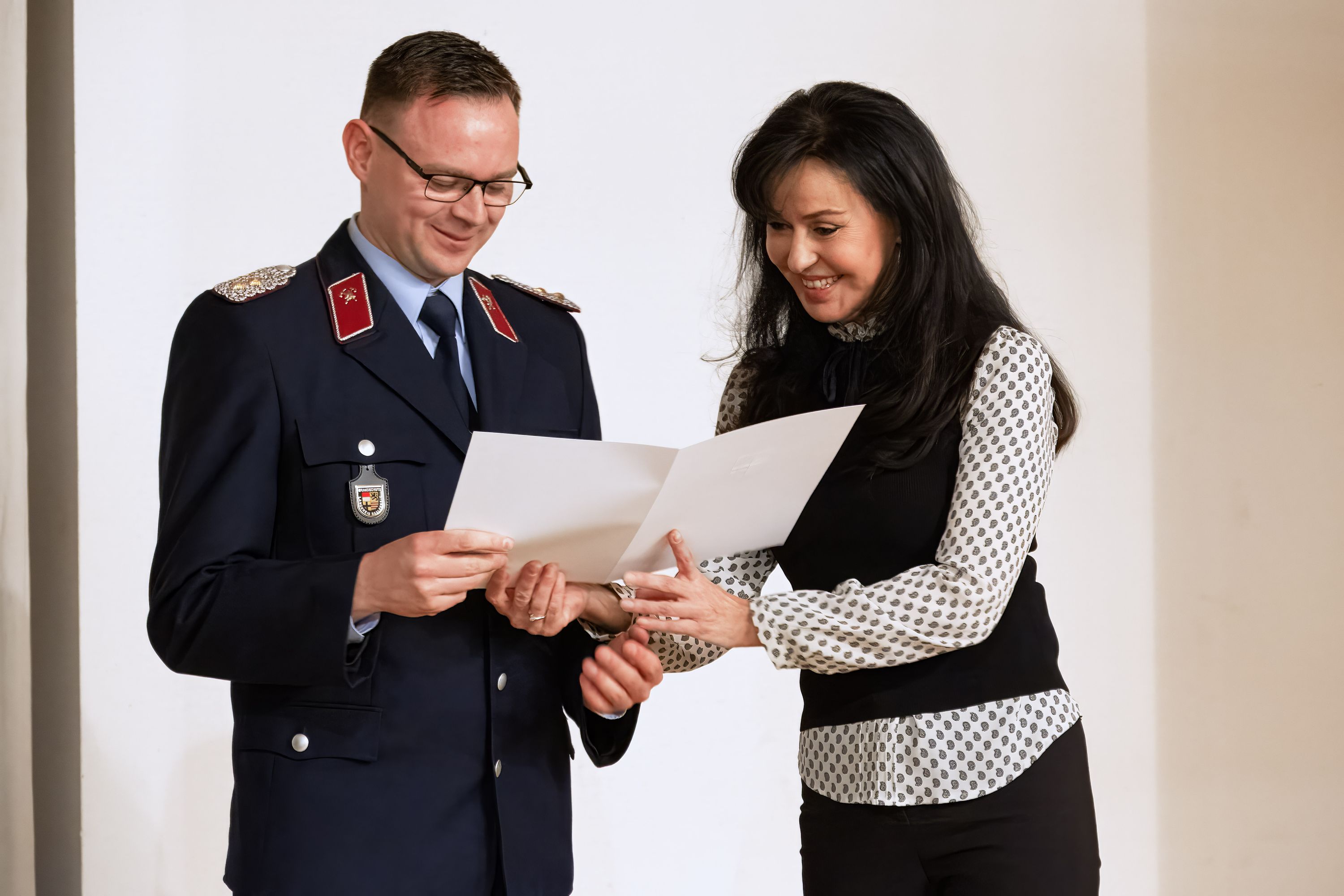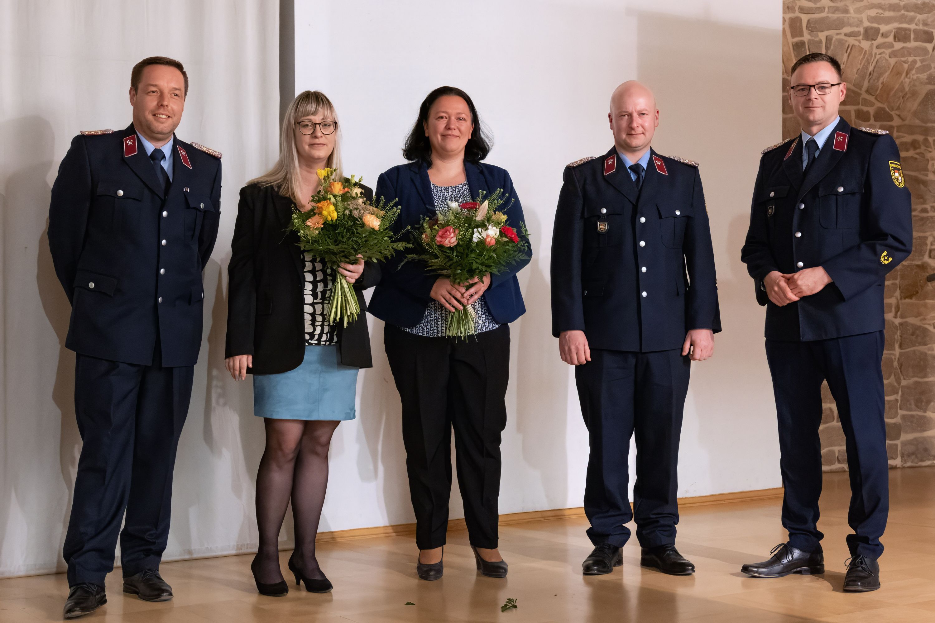 Frau Faulstich nahm dann die Beförderungen vor: Kam. Marcus Heller wurde zum Hauptbrandinspektor befördert, die Kameraden Christian Klose und Paul Bartoszek zum Oberbrandinspektor.