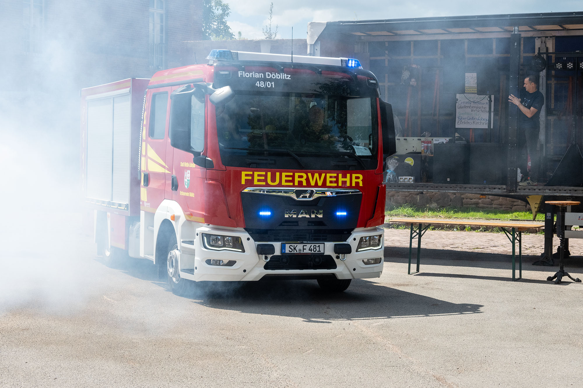 In einer Inszenierung aus Musik, Übungsrauch und Lichteffekten tauchte das langersehnte Fahrzeug mit eingeschalteter Sondersignalanlage aus dem Nebel auf, um von diesem Tag an für die Feuerwehr bereitzustehen.